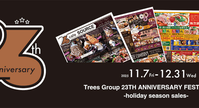 日頃からご愛顧いただき、誠にありがとうございます。 おかげさまでTreesグループは23周年を迎えることができました。 2002年にcafé-nee、cafe SOURCEから始まったTreesグループも、11店舗に増え[…..]