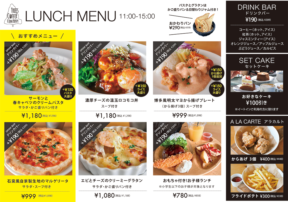 Lunch Menu LUNCH TIME | 11:00 - 15:00 価格は税別表示です。 Drink Bar Set ドリンクバーDrink Bar 全ランチメニューとも+¥190(税別)でドリンクバーがセットにできます。 ホットコーヒー / アイスコーヒー / アイスティー / オレンジジュース / アップルジュース