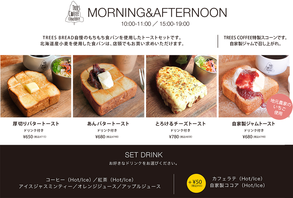 Morning Menu MORNING TIME | 9:00 - 11:00 価格は税別表示です。 セットドリンクSet Drink ホットコーヒー/アイスコーヒー/ホットティー/アイスティー/アイスジャスミンティー